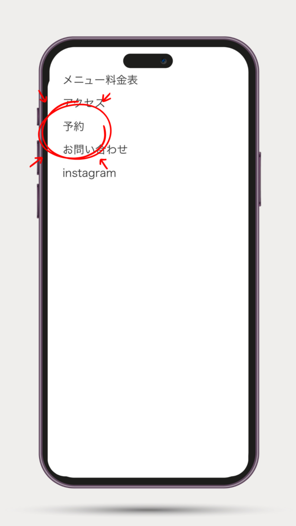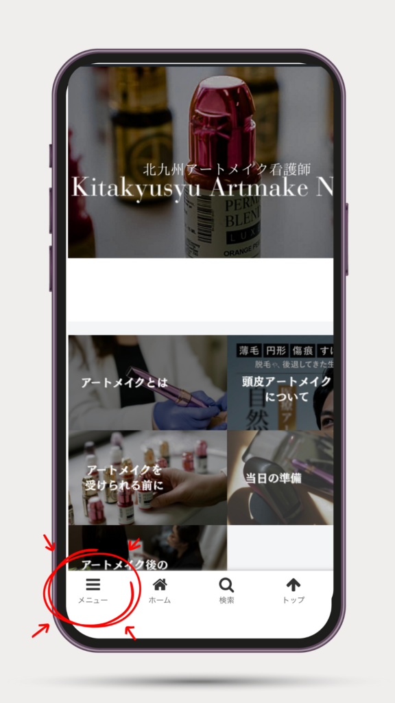 ➀モバイル画面の場合、下部にメニューがあります。「メニュー」を押します。
