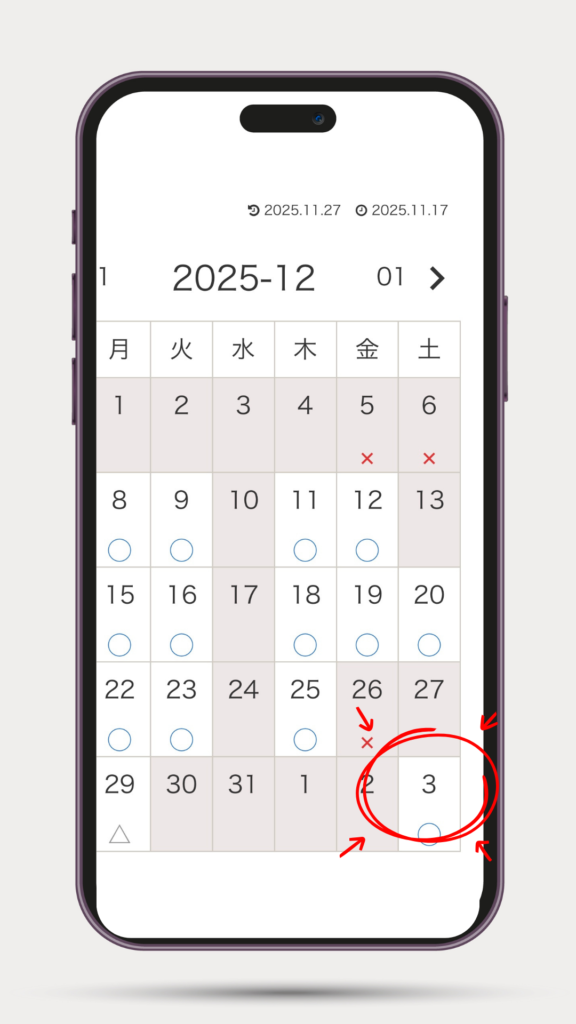 ➂カレンダーの〇または△の表示があるところがご予約可能です。ご希望のお日にちを選択してください。