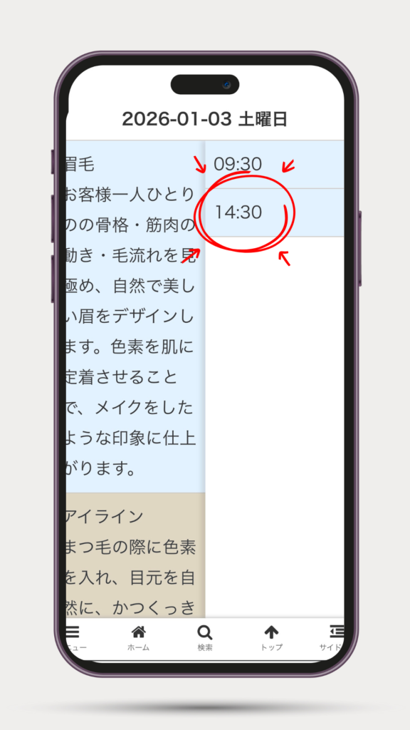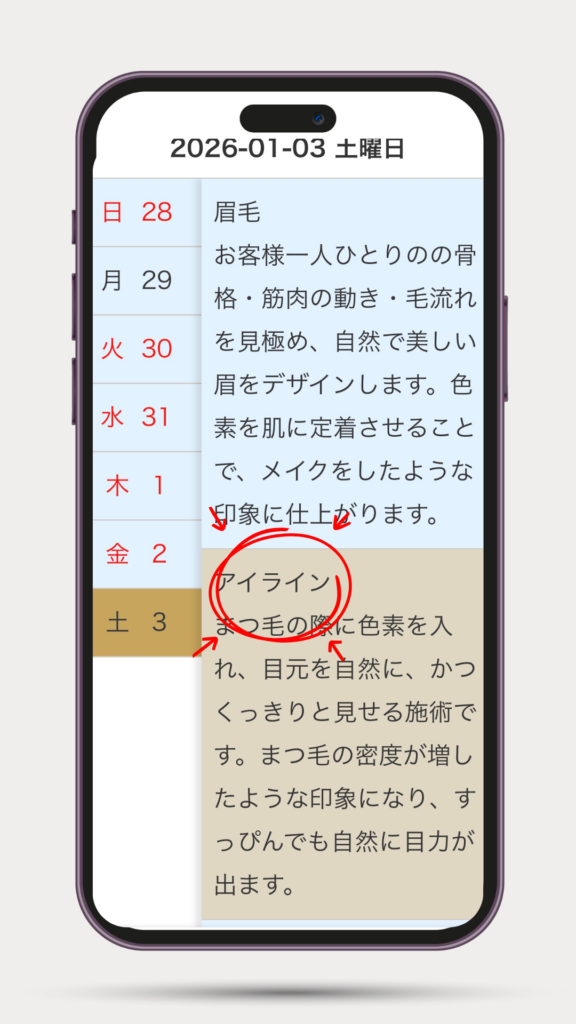 ➃右側のご希望のメニュー(眉毛・アイライン・リップ・頭皮)を選択します。