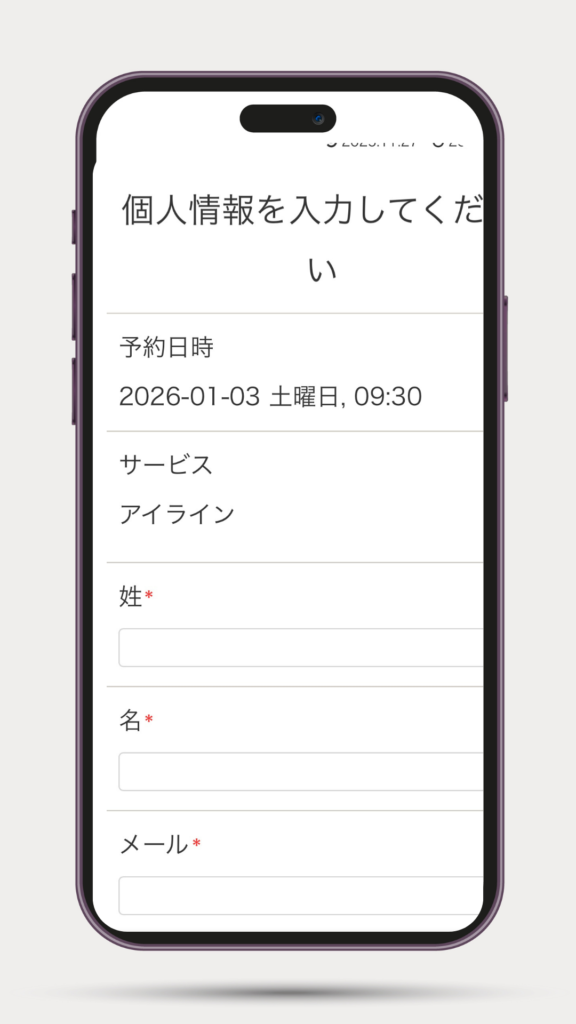 ⑥必要な情報を入力してください。入力後、予約確認のメールをお送りしますのでメールアドレスはお間違えないようご入力ください。