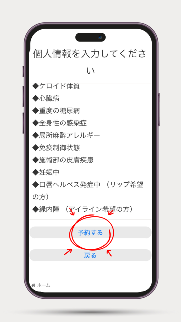 ⑦禁忌事項を確認し、「予約する」のボタンを押せば予約完了となります。
